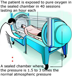 100 % medical grade Oxygen is delivered by nasal masks or oxygen hood. While essentially painless, patients may experience pressure discomfort in the ears initially at the start of pressurization of chamber. It is similar to going downhill or during air travel. A parent can accompany a young child in the HBOT chamber.